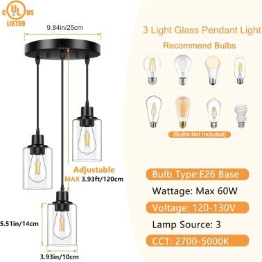 • Licperron 3-Light Pendant Light Fixtures, Black Pendant Lights Kitchen Island, Adjustable Pendant Lighting with Clear Glass Shade, Modern Hanging Light Fixtures for Dining Room, Hallway, Living Room