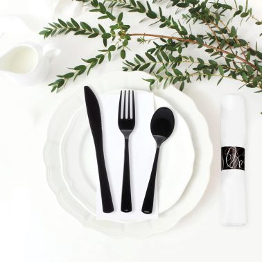 • Party Essentials Pre-Rolled Disposable Extra Heavy Duty Plastic Cutlery Kit with Black Fork/Knife/Spoon and 3-Ply White Napkin (Case of 100 rolls)